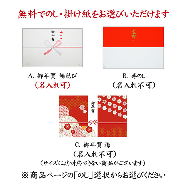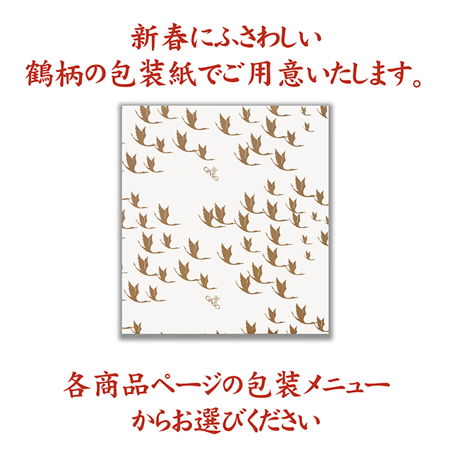 お祝にふさわしい鶴をあしらった包装紙とお年賀用のし・掛け紙を無料でご用意しております。商品ページの選択欄からお選びの上お申し付けください。