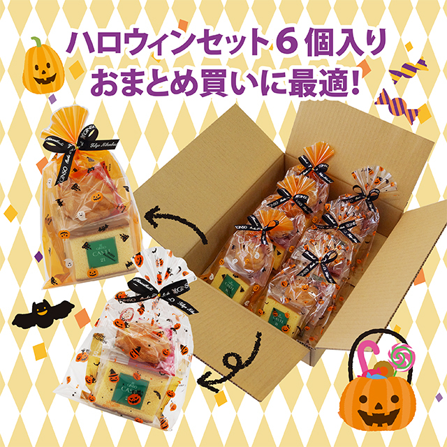 ハロウィン袋(個装カステラ《青箱》1個・マドレーヌ1個・ココナッツフィナンシェ1個)×6袋2種類の袋のセットが3袋ずつ入っています。