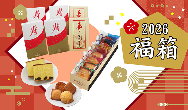荷物お届け遅延などについてはヤマト運輸「重要なお知らせ」をご確認ください。 12月は繁忙期となるため当日出荷対応いたしかねます。何卒ご了承ください TOP 新春 福箱 年の初めに福を呼ぶ、おトクで美味しさいっぱい♪新春特別お買得価格の福箱 人気商品を詰合せた2種類からお選びいただけます ご予約期間:2025年12月10日(水)0:00〜25日(木)23:59まで お届け期間:2025/12/30(火)〜2026/1/6(火)からお選びください*1月1日除く ※送料は全国一律550円(税込)です。12/15(月)まで実施中の送料無料キャンペーン対象外商品となります。 表示切替: 写真のみ 説明付き 並び順: 標準 レビューの多い順 おすすめ商品順 新着商品順 値段の安い順 値段の高い順 名前:昇順 名前:降順 eギフト対象商品 在庫: 在庫あり 在庫なし含む 2件中1件〜2件を表示 商品一覧 【12/25(木)23:59まで お買得 新春特別価格】2026新春 福箱 松 (予約販売品 通常品同梱不可) ¥5,400(税込) 福箱 松(新春特別価格) 新年の初めに「福」を呼ぶ、美味しさいっぱい笑顔あふれること間違いなしのおトクな福箱 お正月限定のおめでたい特別パッケージの「寿カステラ」、縁起物の黒豆を使った「寿 黒豆かすてら」、焼き菓子7個の人気商品を詰め合わせた新春にふさわしいセットです。 特別価格でご用意いたしました! 【12/25(木)23:59まで お買得 新春特別価格】2026新春 福箱 梅 (予約販売品 通常品同梱不可) ¥3,240(税込) 福箱 梅(新春特別価格) 新年の初めに「福」を呼ぶ、美味しさいっぱい笑顔あふれること間違いなしのおトクな福箱 お正月限定のおめでたい特別パッケージの「寿カステラ」、焼菓子「マドレーヌ」・「ココナッツフィナンシェ」の人気商品を詰め合わせた新春にふさわしいセットです。 特別価格でご用意いたしました! 2件中1件〜2件を表示