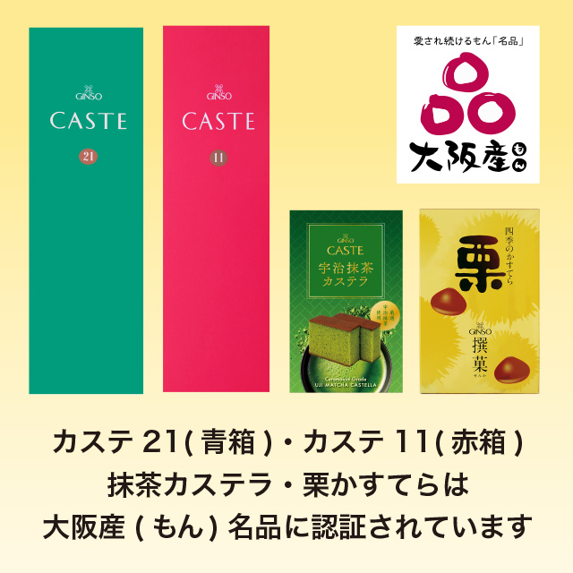 弊社カステラ銀装は、「カステ21青箱」「カステ11赤箱」「抹茶カステラ」に加えて2025年度より「栗かすてら」も認証頂き、計4品が認証されております。