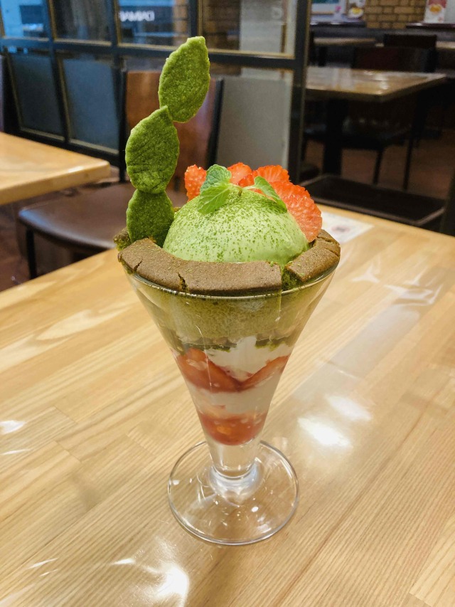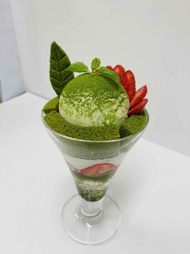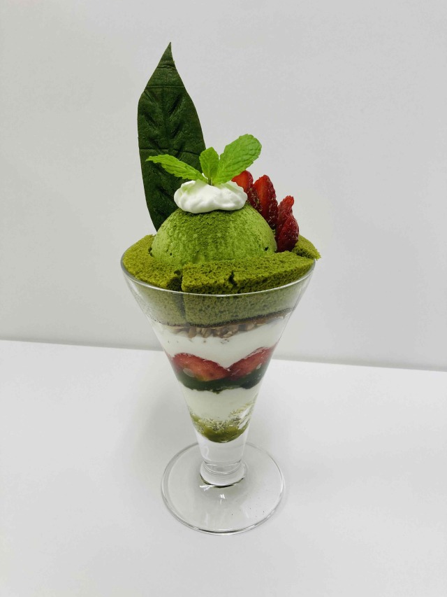 爽やかなクラッシュゼリーと色鮮やかな抹茶味のゼリーに加え、抹茶ソースを加えた生クリームに食感が楽しいグラノーラ。