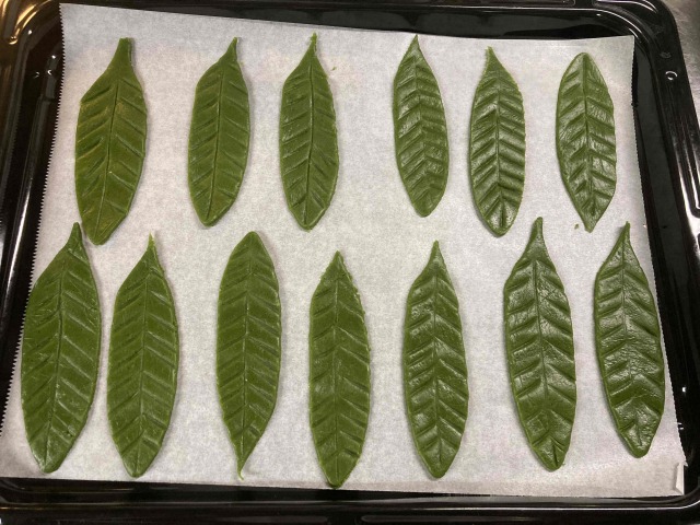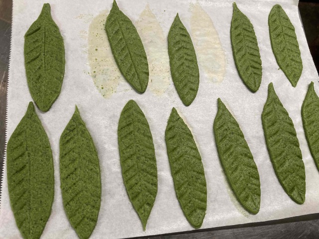 その上には抹茶味のアイスクリームとメインの宇治抹茶カステラを乗せ、仕上げに葉っぱの形を大きなクッキーを載せた、見た目にも色鮮やかなパフェとなっております。