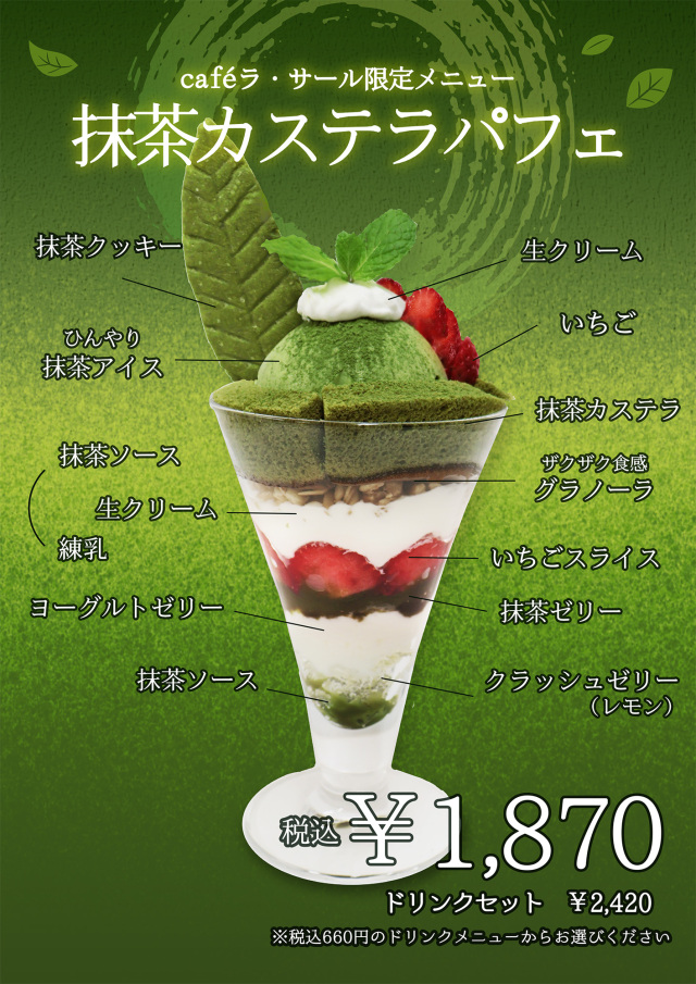 今回、大人気のカステラパフェに加えて、宇治抹茶カステラを使用したパフェが本店2階のカフェにてご提供開始させて頂きます。