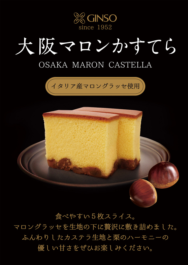 大阪を代表するカステラ専門店である銀装がこだわりの栗を使った大阪土産として発売する栗のカステラです。