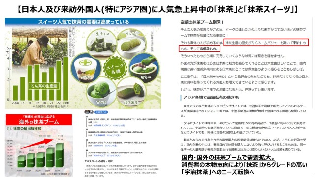 市場では「日本の抹茶が健康的に体に良い」との認識が普及しており、さらには通常の抹茶だけではなく、ワンランク上の「宇治抹茶」のニーズがさらに拡大しています。