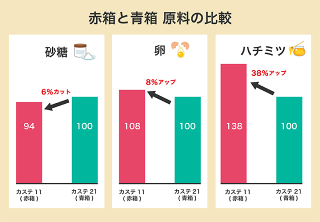 カステ21青箱と比べ、お砂糖の量を減らし、ハチミツと卵黄の量を多くしております。さらに生地に脱脂粉乳を加えることで、より洋風でミルキーな味わいに仕上げています。